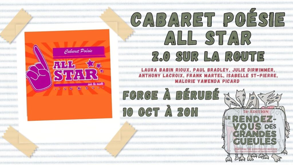 Le Cabaret All Star sur la route revient au festival de conte Le Rendez-Vous des Grandes Gueules à Trois-Pistoles en version 2.0! Dirigé par Isabelle St-Pierre, le cabaret vous invite à la rencontre de 7 poètes tous azimuts, qui sont aussi des acteurs.trices important.e.s du milieu de la parole vivante.De retour après sa première version … Continuer la lecture de Cabaret All Star sur la route 2.0 au Rendez-vous des Grandes Gueules
